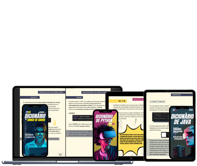 Guias práticos e definitivos de Python, Java e SQL. O conhecimento que você precisa para não ficar para trás no mercado de tecnologia. Estude no ônibus, em casa ou no trabalho.